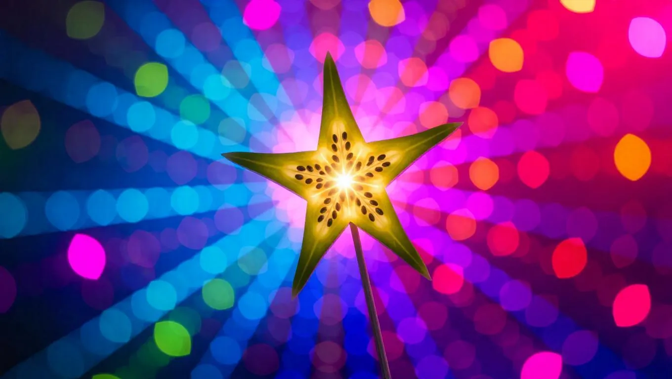 Spear with starfruit blade, radiant radial glow, vibrant abstract background, luminescent details, mystical ambiance