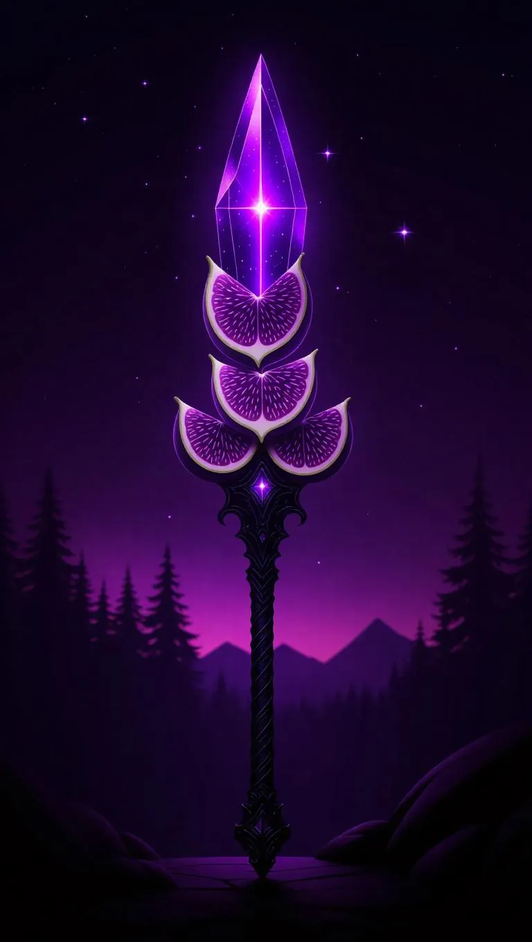 A glaive crafted from overlapping fig segments, with a translucent, purple core that emits a soft, celestial glow. The weapon has an elegant, tapered design, set against a starry night sky that enhances its otherworldly beauty. The scene is bathed in twilight, ambient light, with stars twinkling in the background. The style is fantastical, blending realism with ethereal elements.