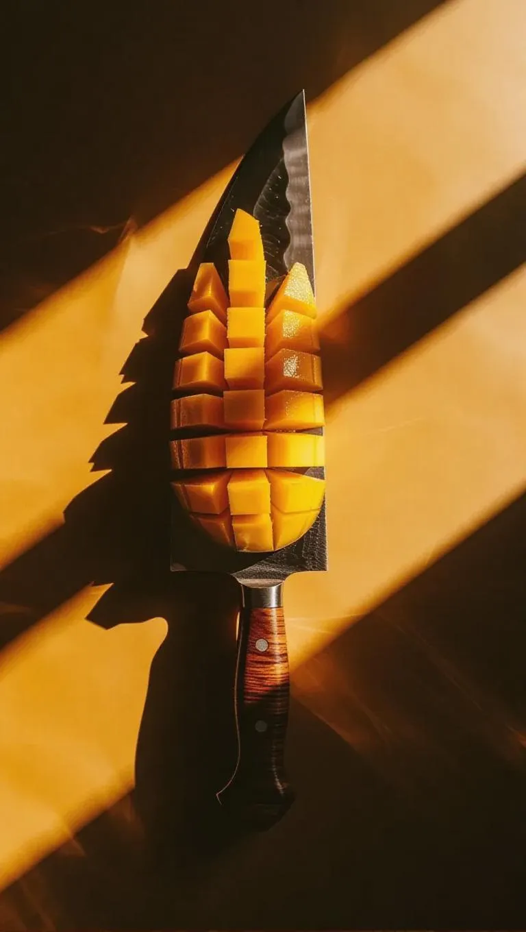 A unique machete crafted from vibrant mango slices, illuminated by a warm golden light, set against a simple, soft shadow background, creating a surreal and artistic composition.