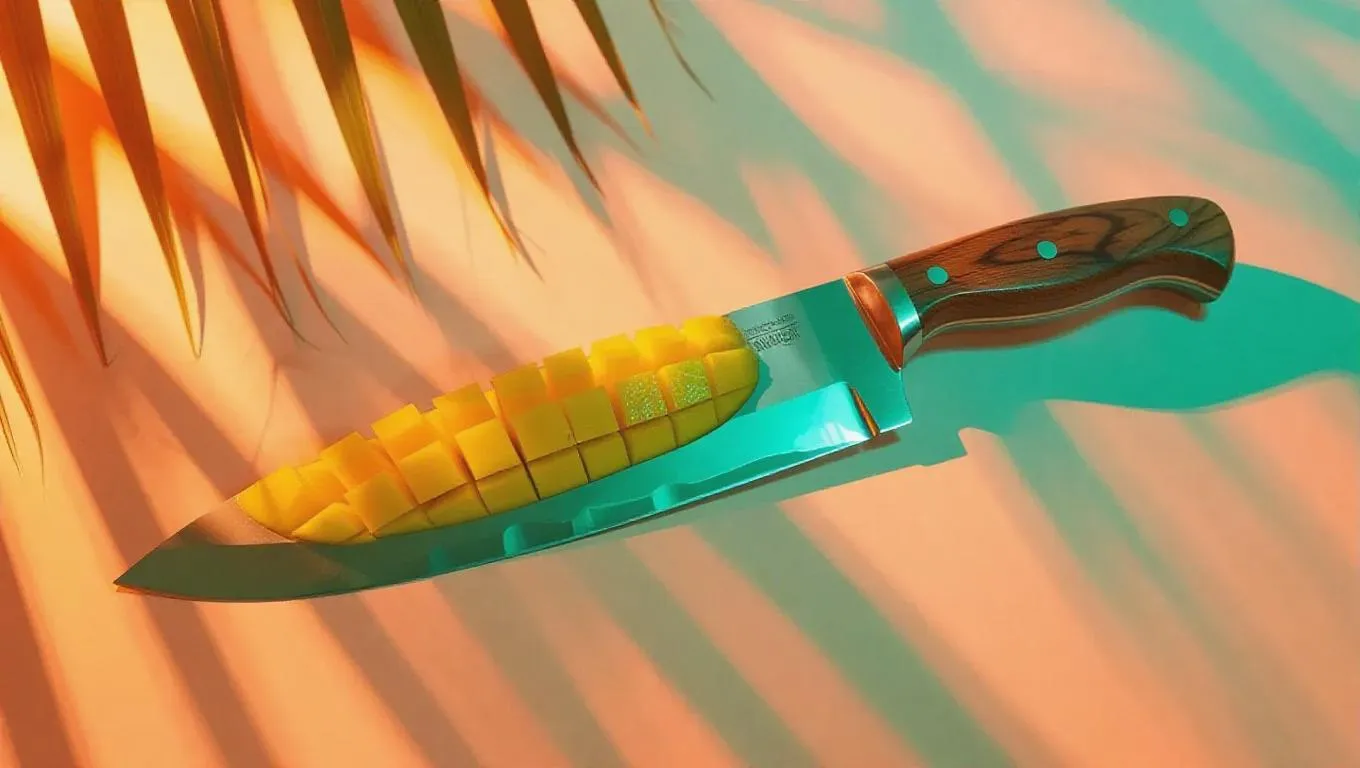 A unique machete crafted from vibrant mango slices, illuminated by a vibrant turquoise light, set against a soft, blurred shadow background, creating a surreal and artistic composition.