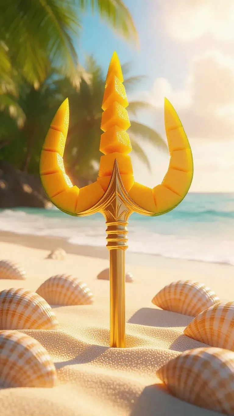A trident intricately crafted from overlapping mango slices, featuring a vibrant, orange core that crackles with zesty energy. The bold and dynamic design is set against a tropical beach background, with seashells scattered in the sand and the sun casting warm, golden light. The scene exudes liveliness and invigoration, capturing the essence of a sunny, coastal paradise.