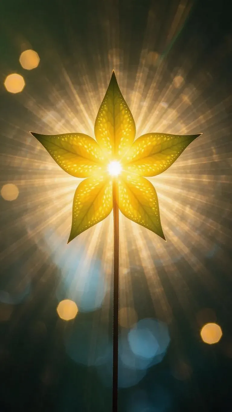 Spear with starfruit blade, radiant radial glow, ethereal soft background, luminescent details, mystical ambiance