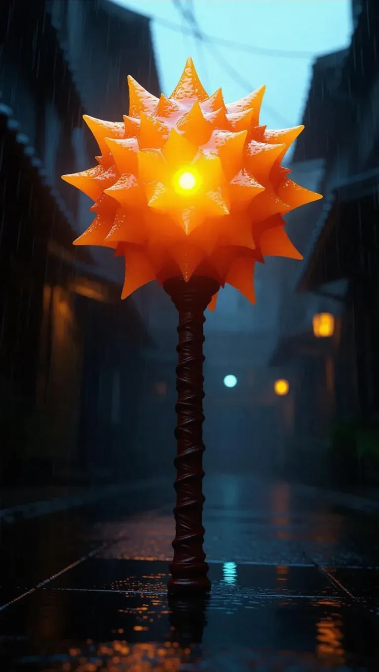 A flail made from spiky starfruit slices, with a bright, fiery orange core glowing warmly, exudes a chaotic and energetic design. Set against a rainy day backdrop, the scene emphasizes the flail’s lively spirit. Soft, filtered sunlight bathes the scene, casting gentle highlights and shadows that enhance the dynamic feel. The style is realistic, with a touch of whimsical fantasy.