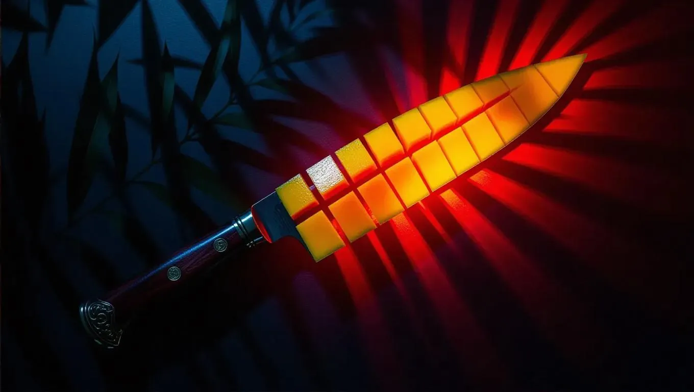 A unique machete crafted from vibrant mango slices, illuminated by a bold red light, set against an intricate, dark shadow background, creating a surreal and artistic composition.