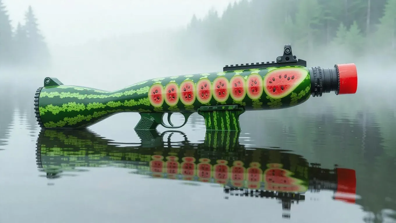 A grenade launcher intricately carved from a watermelon rind, featuring a vibrant green and red design that glows softly in a light fog. Set against a mysterious, foggy lake, the weapon exudes an adventurous and intriguing energy. The lake's calm waters and foggy sky enhance the surreal and vivid nature of the scene. Soft fog light casts gentle shadows, highlighting the weapon's unique texture and color. The style is a blend of realistic and fantastical elements, creating a visually striking image.