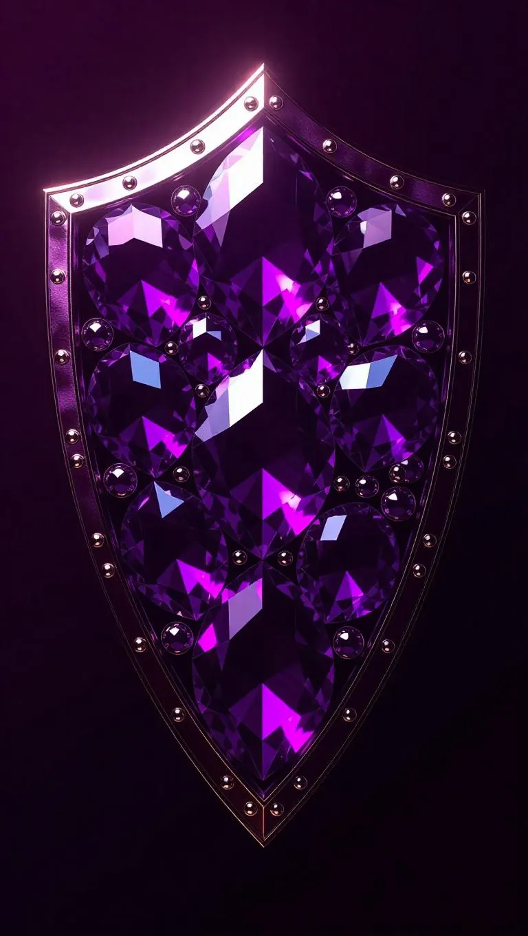 A shield forged from overlapping amethyst stones, each stone rich and purple, sparkling with fiery brilliance. The design is robust and regal, set against a deep, velvety background that enhances its luxurious allure. Soft, warm light illuminates the shield from the front, casting gentle highlights on the stones and deep shadows in the crevices, creating a dramatic contrast. The style is realistic, with a focus on intricate detail and texture.