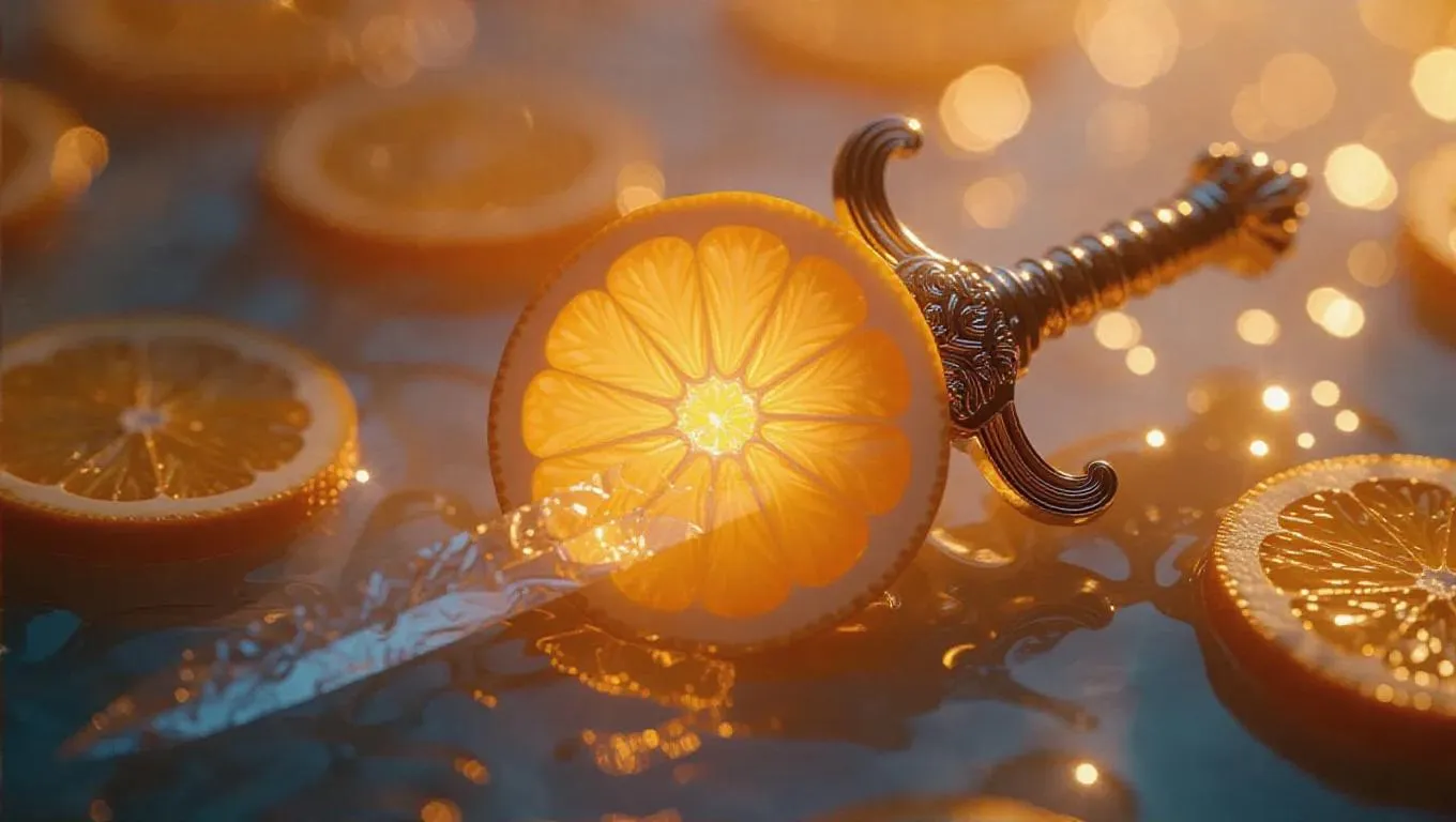 A dagger meticulously carved from translucent citrus slices, featuring a shimmering golden core that radiates a soft, radiant glow. The intricate and delicate design is set against a blurred, bokeh background, enhancing its ethereal and elegant appearance. The lighting is soft and dreamy, enveloping the dagger’s translucency and golden core, creating a romantic and magical atmosphere. The style is whimsical and realistic, blending detailed craftsmanship with a soft-focus aesthetic.