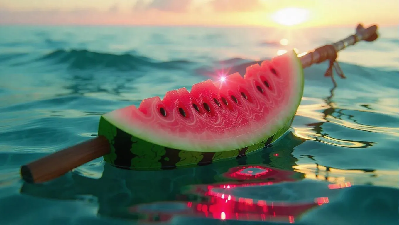 A staff intricately carved from succulent watermelon slices, with a vibrant, glowing pink core that radiates a refreshing, playful light. The staff's sleek and mystical design stands out against a tranquil, turquoise ocean background, enhancing its organic elegance. Soft, diffused moonlight filters across the waves, casting gentle, shimmering reflections and highlighting the staff’s intricate details. The scene exudes a serene, oceanic beauty, capturing the essence of a mystical, enchanted beach.
