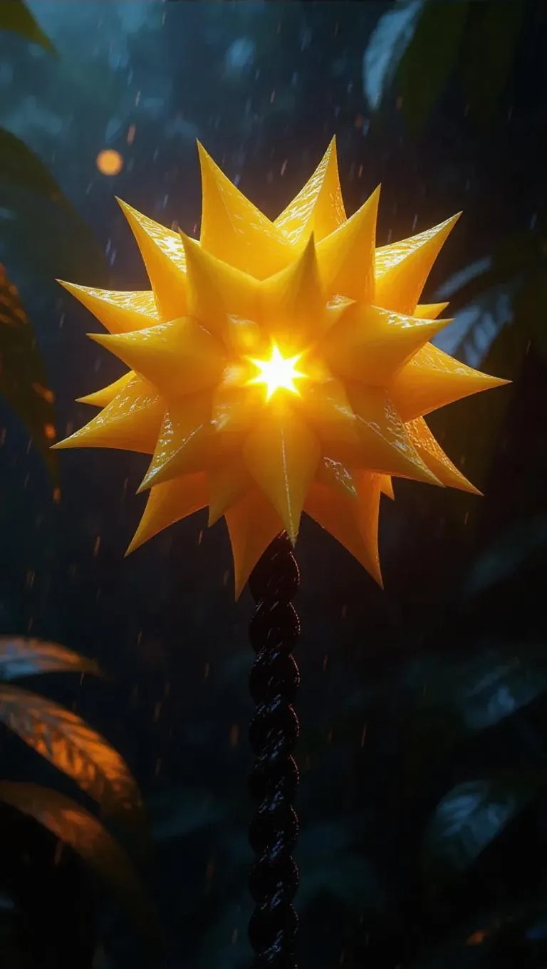 A flail made from spiky starfruit slices, with a bright, yellow core glowing softly, exudes a chaotic and energetic design. Set against a dark stormy background, the scene emphasizes the flail’s lively spirit. Soft, muted sunlight bathes the scene, casting gentle highlights and shadows that enhance the dynamic feel. The style is realistic, with a touch of whimsical fantasy.