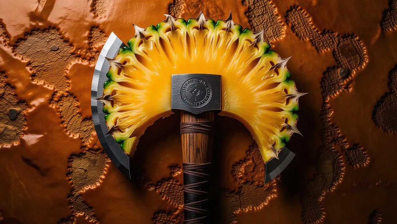A battle axe forged from robust pineapple rings, featuring a fiery orange core that crackles with energy, boasting a bold and powerful design, set against a rugged, earthy background that emphasizes its formidable strength.
