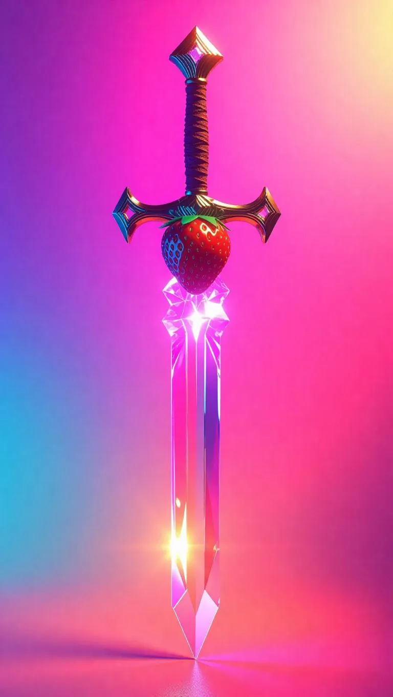 Strawberry sword with a crystal-like blade, radiant aura effects, minimalist design, artistic and modern, set against a colorful gradient background, emphasizing the weapon's elegance and otherworldly presence.
