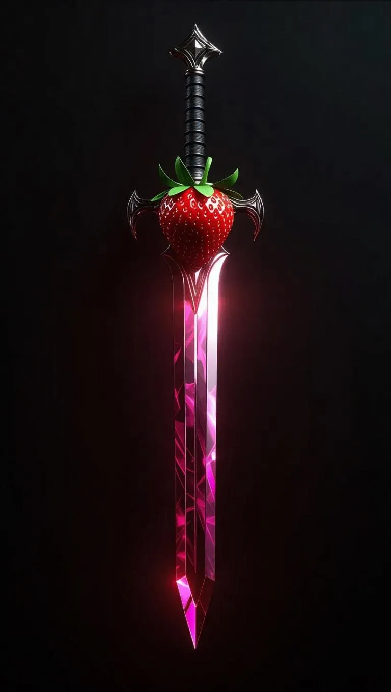 Strawberry sword with a crystal-like blade, glowing aura effects, intricate design, sleek and modern, set against a dark gradient background, emphasizing the weapon's elegance and otherworldly presence.