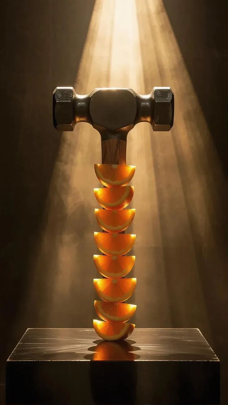A hammer with orange segments as its head, under a spotlight, creating an abstract art piece with a focused and sharp vibe, emphasizing the unique fusion of everyday tools and scientific elements.
