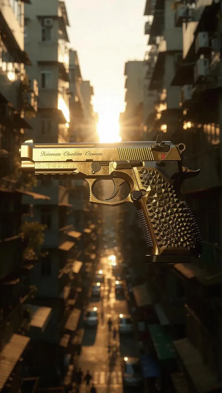 A handgun forged from the dense, spiky exterior of a durian, exuding a pungent yet powerful aura. The pistol's elegant and flowing design stands out against a bustling urban skyline backdrop. Soft, golden hour sunlight bathes the buildings, casting long shadows and highlighting the weapon's intricate details. The scene is rendered in a hyper-realistic style, emphasizing the contrast between nature and technology.