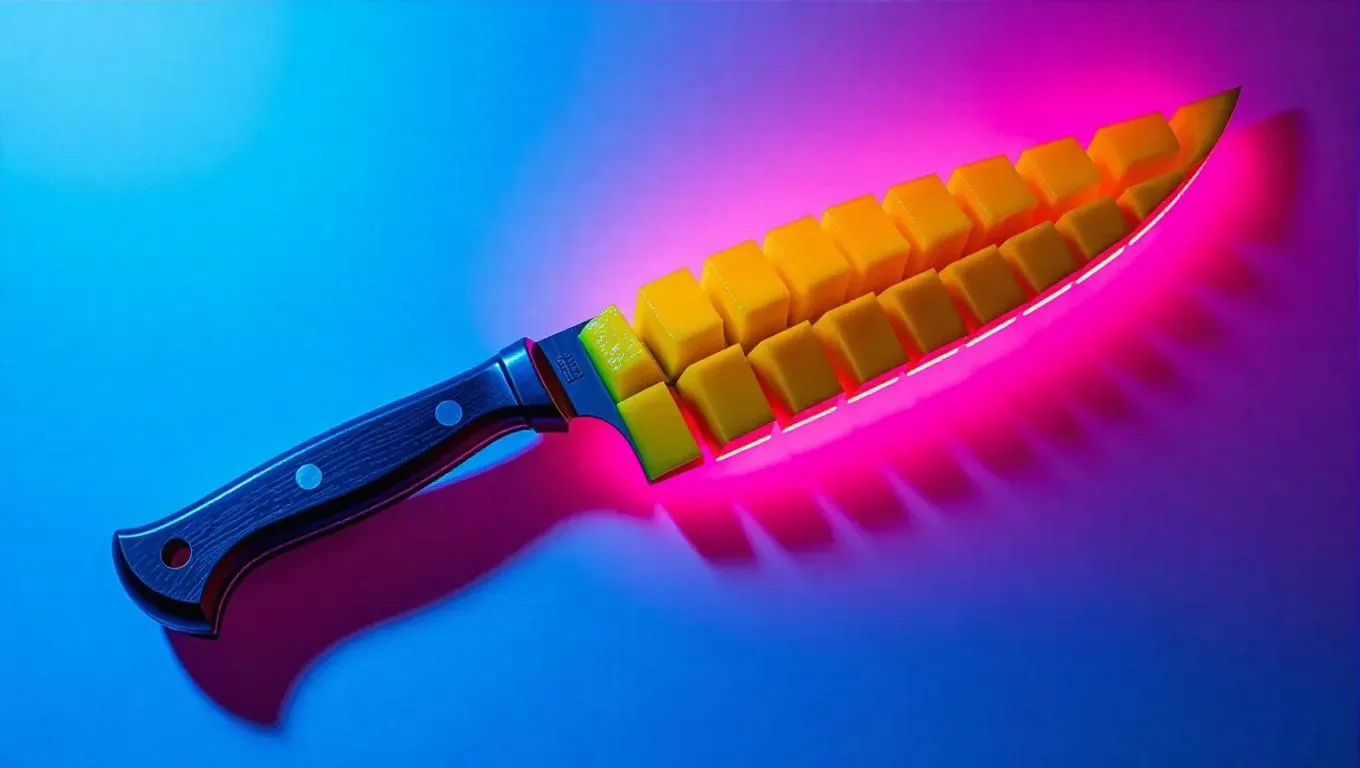 A unique machete crafted from vibrant mango slices, illuminated by neon pink light, set against a detailed, soft shadow background, creating a surreal and artistic composition.