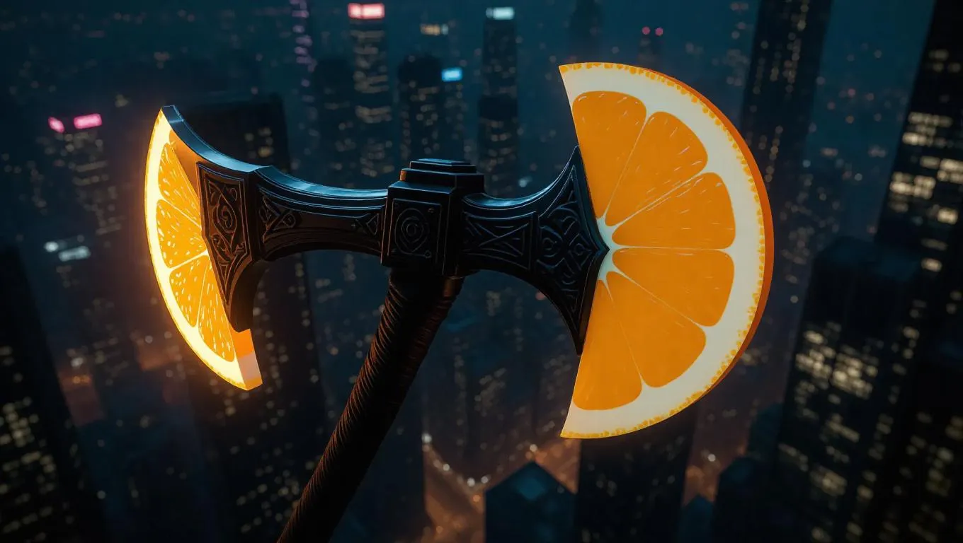A large battle axe with an orange slice-shaped blade, illuminated by artificial lights, casting sharp shadows and preparing for a showdown. The axe is positioned against a futuristic city skyline, creating a bold and edgy atmosphere.