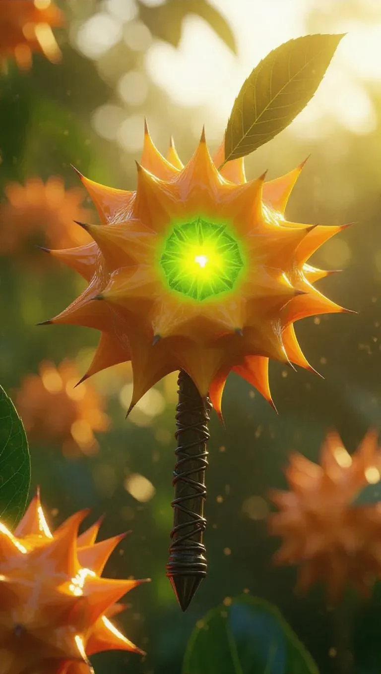 A flail made from spiky starfruit slices, with a bright, green core glowing warmly, exudes a chaotic and energetic design. Set against a vibrant spring background, the scene emphasizes the flail’s lively spirit. Soft, warm sunlight bathes the scene, casting gentle highlights and shadows that enhance the dynamic feel. The style is realistic, with a touch of whimsical fantasy.