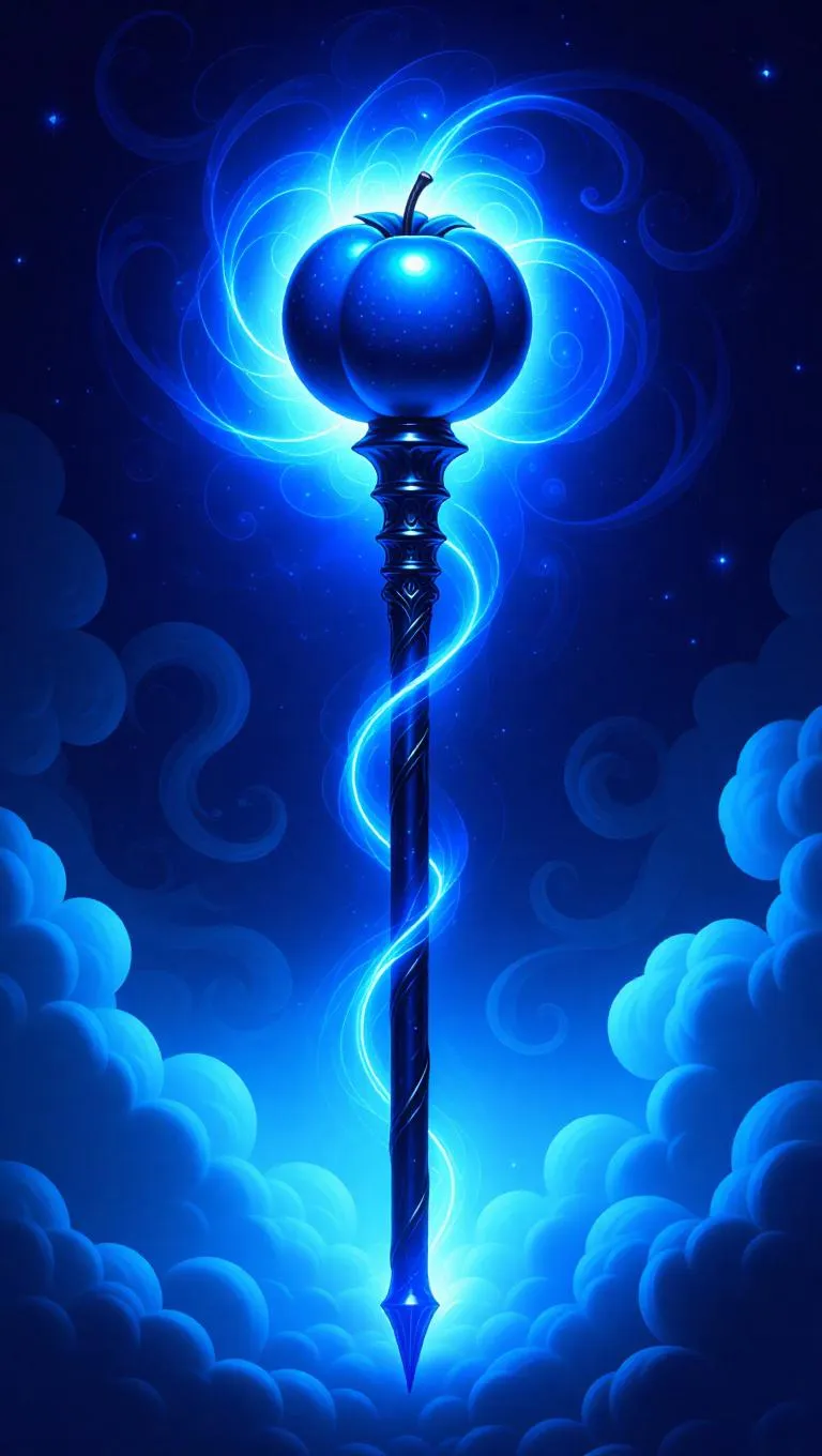 A mystical magic staff topped with a glowing blueberry, surrounded by swirling clouds, set against a backdrop of swirling cosmic energy, creating a dramatic and powerful atmosphere.