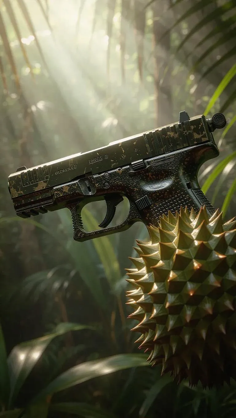 A handgun forged from the dense, spiky exterior of a durian, exuding a pungent yet powerful aura. The pistol's intimidating and modern design stands out against a dense, tropical rainforest backdrop. Soft, diffused sunlight filters through the canopy, casting dappled shadows and highlighting the weapon's intricate details. The scene is rendered in a hyper-realistic style, emphasizing the contrast between nature and technology.