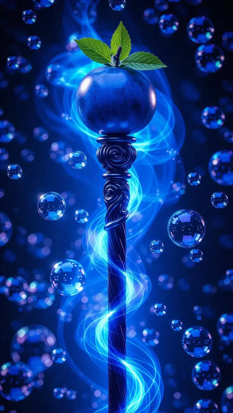 A mystical magic staff topped with a glowing blueberry, surrounded by shimmering bubbles, set against a backdrop of swirling cosmic energy, creating a whimsical and playful atmosphere.