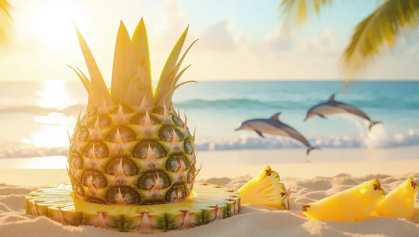 A trident intricately crafted from overlapping pineapple slices, featuring a vibrant, yellow core that crackles with zesty energy. The bold and dynamic design is set against a tropical beach background, with dolphins jumping in the ocean and the sun casting warm, golden light. The scene exudes liveliness and invigoration, capturing the essence of a sunny, coastal paradise.