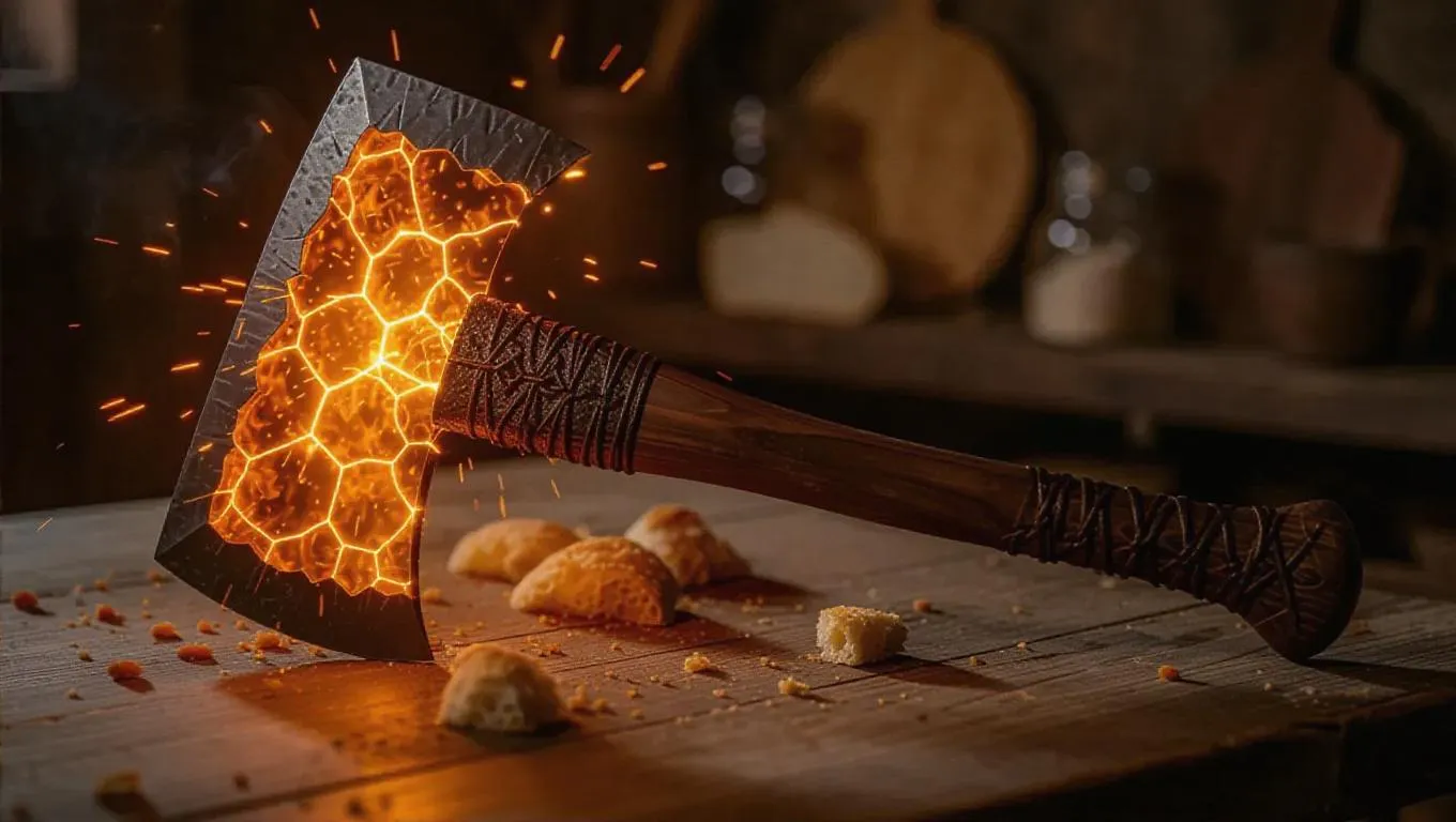 A battle axe forged from hard bread crusts, featuring a fiery orange core that crackles with energy, boasting a bold and powerful design, set against a rustic kitchen background that emphasizes its formidable strength.