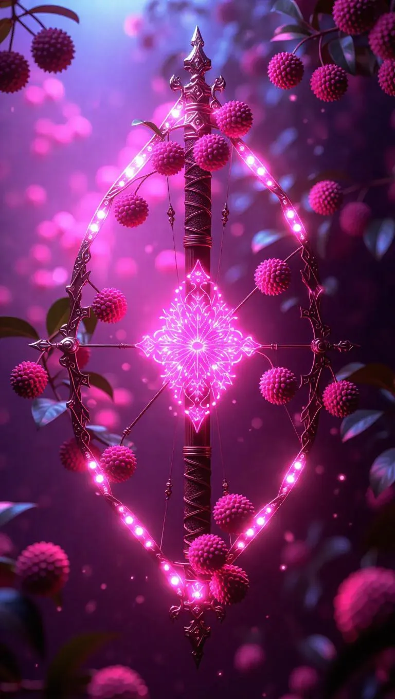 A crossbow intricately crafted from lychee wood and adorned with lychee fruit, emitting a soft, ethereal pink glow, set against a mystical backdrop with delicate floral patterns and shimmering light effects, enhancing the weapon's enchanting and unique design