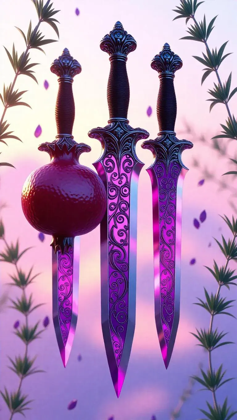 Dual daggers inspired by pomegranates and thyme leaves, floating composition, intricate blade designs with swirling pomegranate patterns and thyme leaf engravings, ethereal glow, set against a soft, dreamy background with subtle hints of twilight.