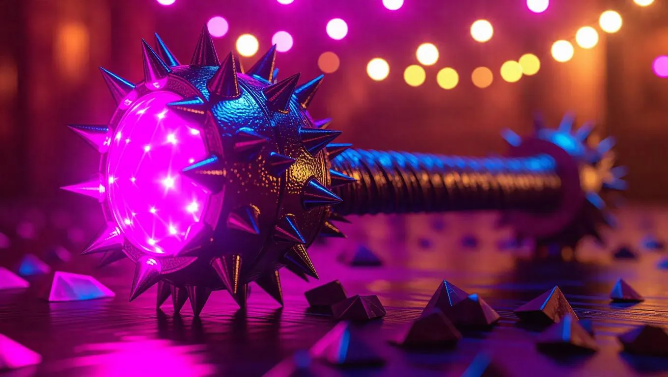 A mace forged from spiky citrus segments, featuring a fluorescent pink core that pulses with an intense aura. The rugged and intimidating design is set against a vibrant carnival background, enhancing its fearsome presence. Soft, ambient light casts subtle shadows, highlighting the mace's textured surface. The style is festive fantasy, emphasizing the weapon's colorful and menacing nature.