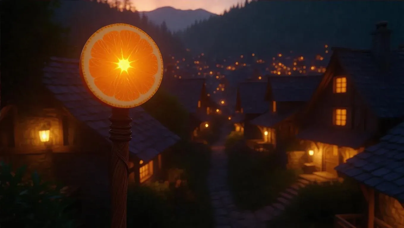 A staff intricately carved from succulent tangerine slices, with a vibrant, glowing saffron core that radiates an energetic, cheerful light. The staff's sleek and mystical design stands out against a bustling village background, enhancing its organic elegance. Soft, diffused evening light bathes the rooftops, casting gentle, harmonious shadows and highlighting the staff’s intricate details. The scene exudes a serene, village beauty, capturing the essence of a mystical, enchanted hamlet.