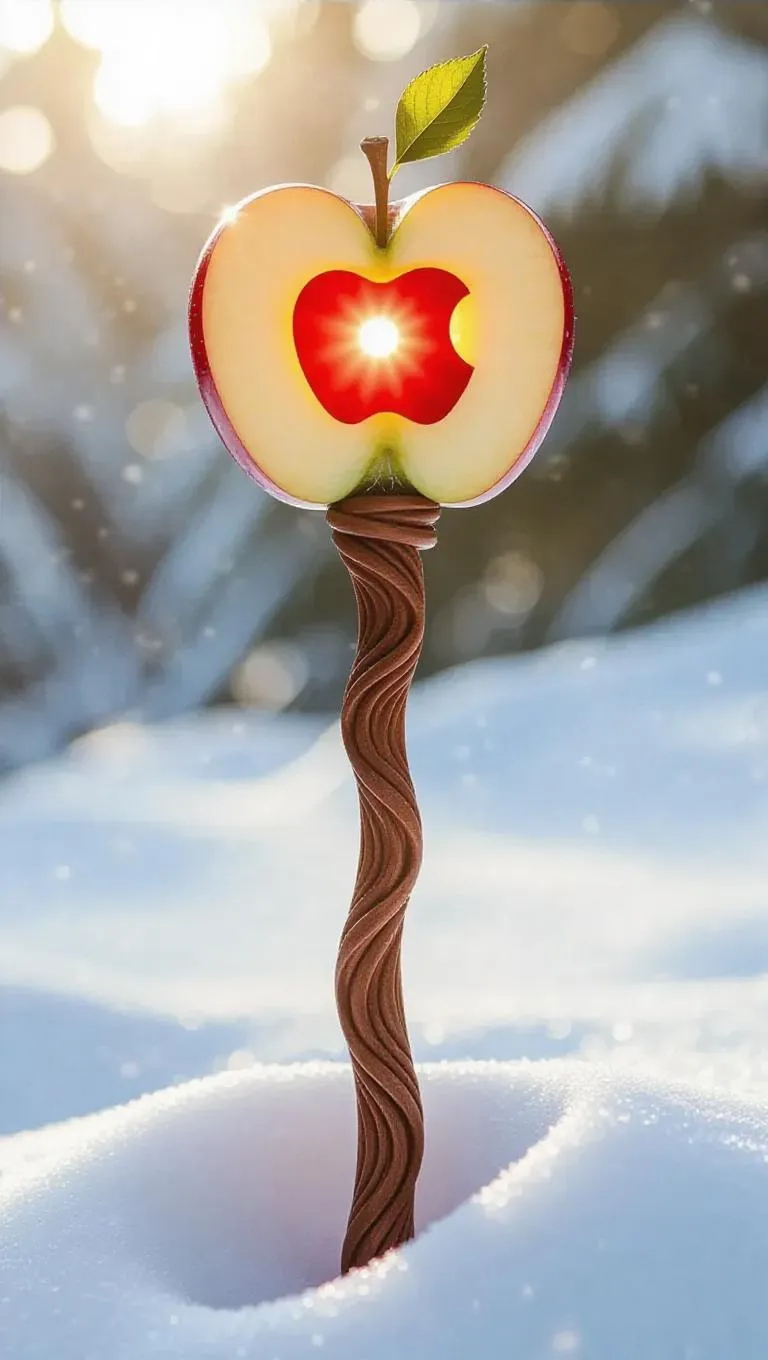 A staff intricately carved from succulent apple slices, with a vibrant, glowing red core that radiates a sweet, inviting light. The staff's sleek and mystical design stands out against a snowy, white winter background, enhancing its organic elegance. Soft, diffused winter sunlight glistens off the snow, casting gentle, crisp shadows and highlighting the staff’s intricate details. The scene exudes a serene, wintry beauty, capturing the essence of a mystical, enchanted winterland.