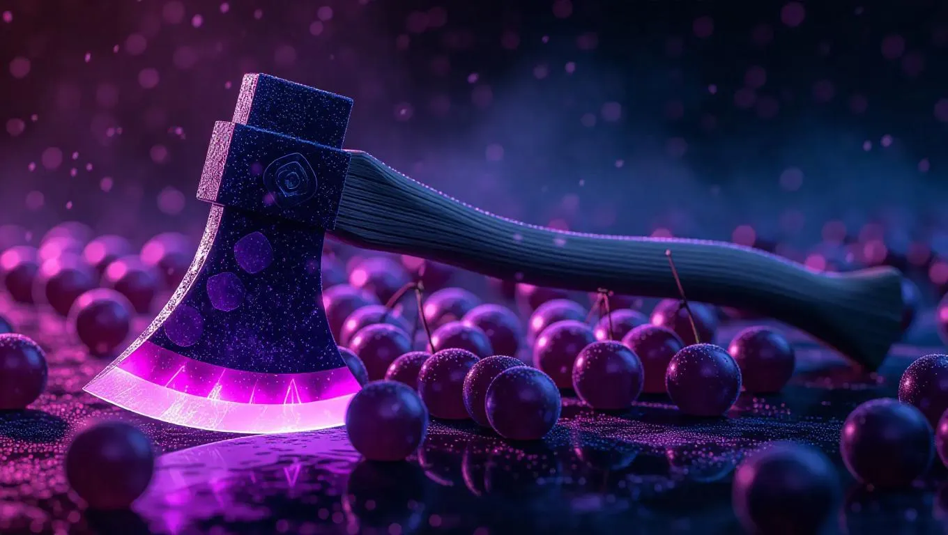 Axe crafted from frozen grape slices, shimmering with icy frost particles, glowing with a cold, ethereal light, set against a dark, mystical background, capturing the essence of frosty magic.