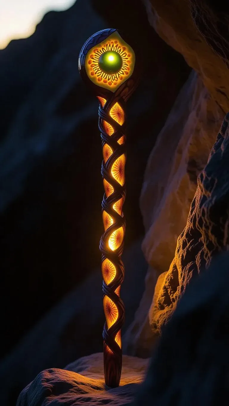 A staff intricately carved from succulent fig slices, with a vibrant, glowing olive core that radiates a calming, peaceful light. The staff's sleek and mystical design stands out against a secluded rocky cliff background, enhancing its organic elegance. Soft, diffused twilight light streams through the gaps, casting gentle, dramatic shadows and highlighting the staff’s intricate details. The scene exudes a serene, isolated beauty, capturing the essence of a mystical, enchanted cliffside.