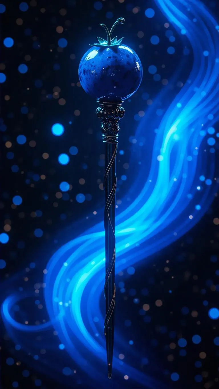 A mystical magic staff topped with a glowing blueberry, surrounded by floating luminescent particles, set against a backdrop of swirling cosmic energy, creating an enchanting and otherworldly atmosphere.