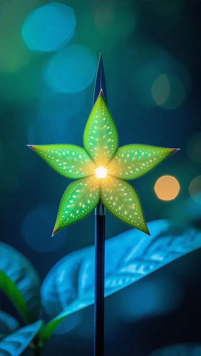 Spear with starfruit blade, radiant radial glow, dreamy soft background, luminescent details, magical ambiance