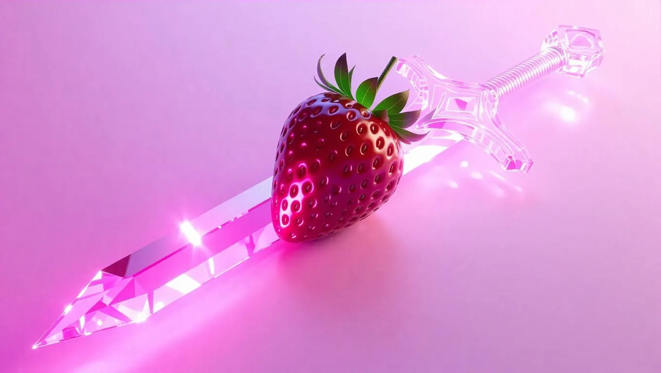 Strawberry sword with a glass-like blade, glowing aura effects, minimalist design, sleek and modern, set against a soft gradient background, emphasizing the weapon's elegance and otherworldly presence.