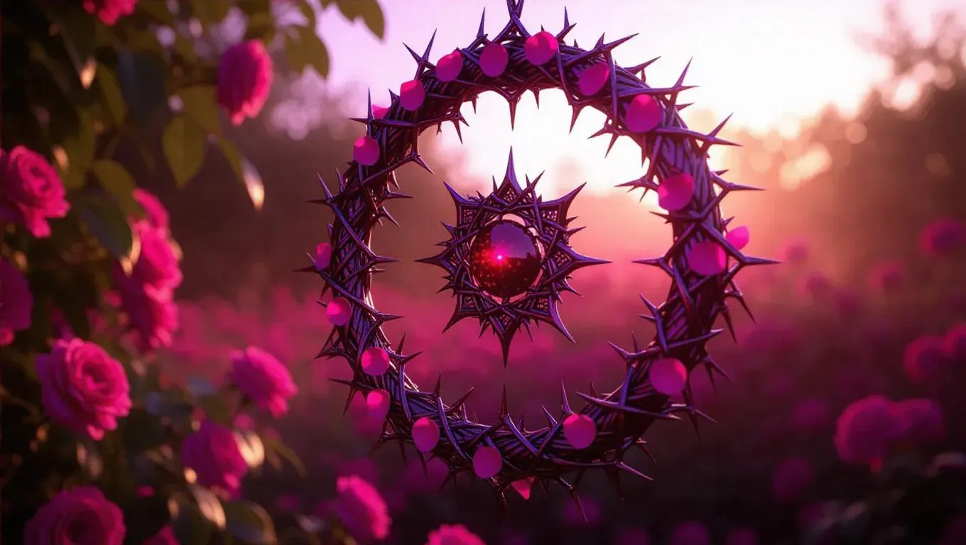 A chakram intricately woven from rose thorns and petals, with a deep, red core shimmering with a mystical, midday glow. The circular and elegant design is set against a garden at noon, where the bright sunlight casts a vibrant, pink hue over the lush foliage, enhancing the weapon's enchanting and versatile power. Soft, diffused light highlights the intricate details, creating a serene yet powerful atmosphere. Style: Mystical realism.
