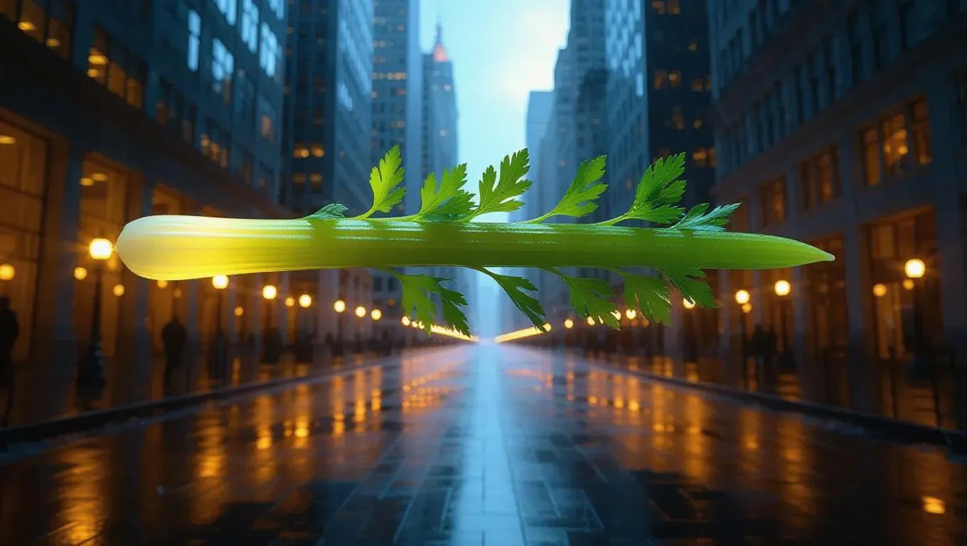 A spear forged from elongated celery slices, with a crisp, white core emitting a refreshing glow, showcasing a sleek, streamlined design. Set against a serene, urban background, the tranquil beauty of the spear is highlighted by soft, diffused lighting, creating a calm and ethereal atmosphere. The buildings reflect the spear's luminescence, enhancing its otherworldly appearance. Style: Realistic.