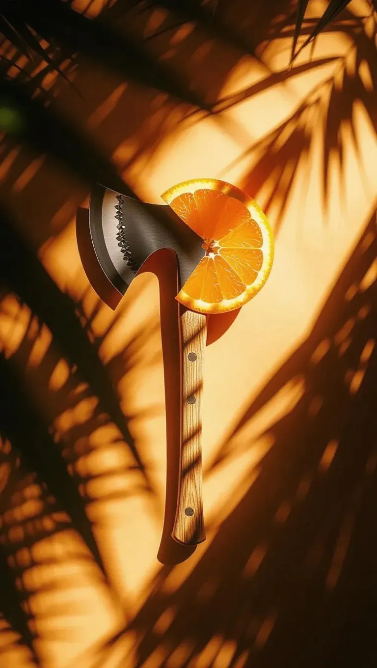 Axe with a vibrant orange slice blade, tropical aesthetic, soft twilight lighting, gentle breezes, warm golden hues, and a dramatic shadow play, capturing the essence of a sunlit jungle.