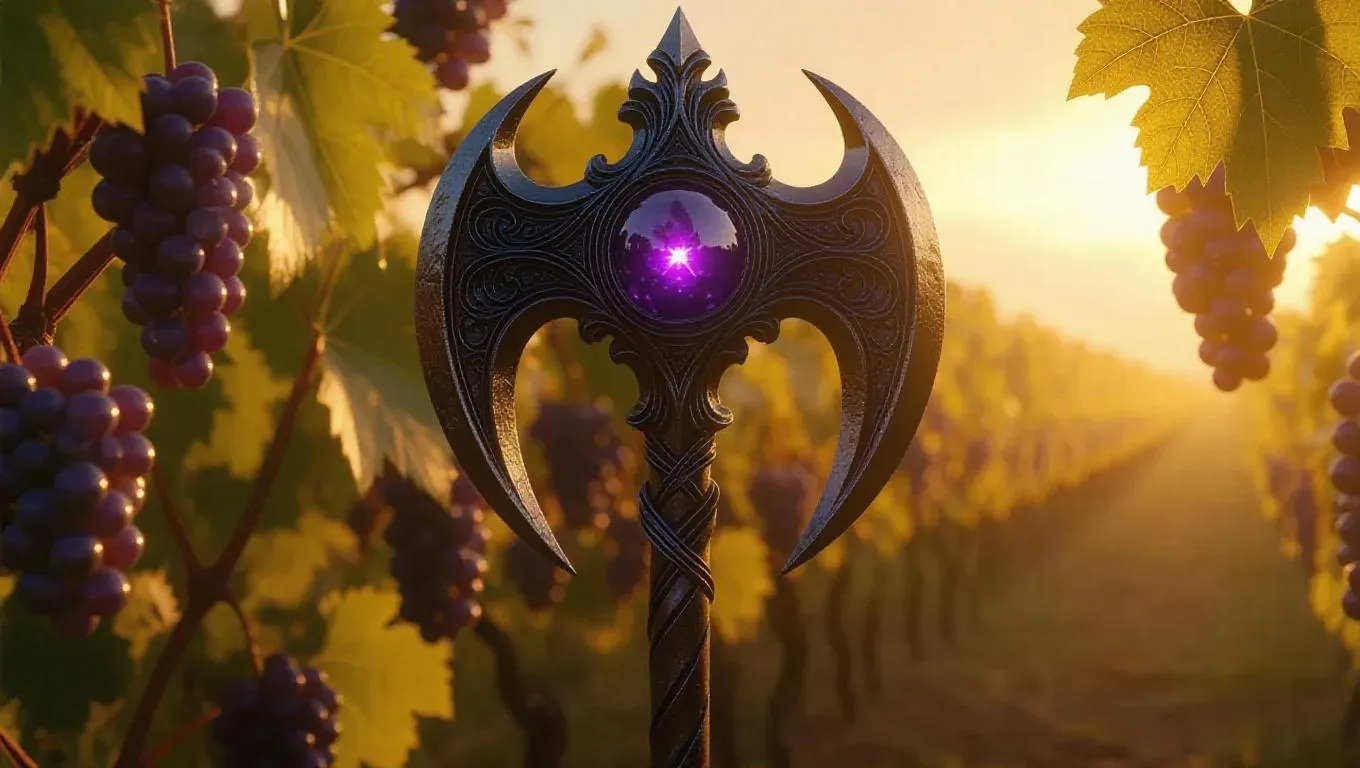A halberd intricately carved from grapes, featuring a rich purple core that emits a soft, fruity glow. The design is classic and charming, emphasizing both beauty and lethality. Set against a vineyard background, the scene highlights the weapon's fruitful yet deadly elegance. Soft, golden light bathes the scene, casting lovely shadows that enhance the halberd's intricate details. The style is realistic, blending agricultural elements with a hint of fantasy.
