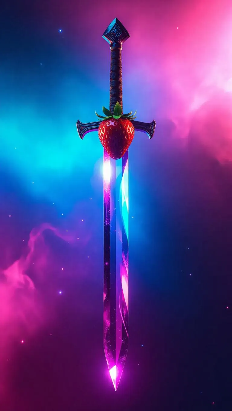 Strawberry sword with a crystal-like blade, glowing aura effects, minimalist design, sleek and modern, set against a celestial gradient background, emphasizing the weapon's elegance and otherworldly presence.