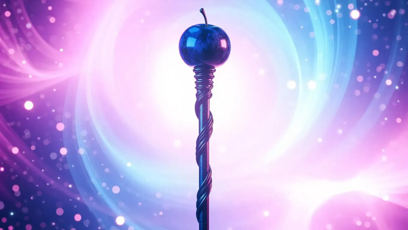 A mystical magic staff topped with a glowing blueberry, surrounded by magical sparkles, set against a backdrop of swirling cosmic energy, creating a dreamy and uplifting atmosphere.