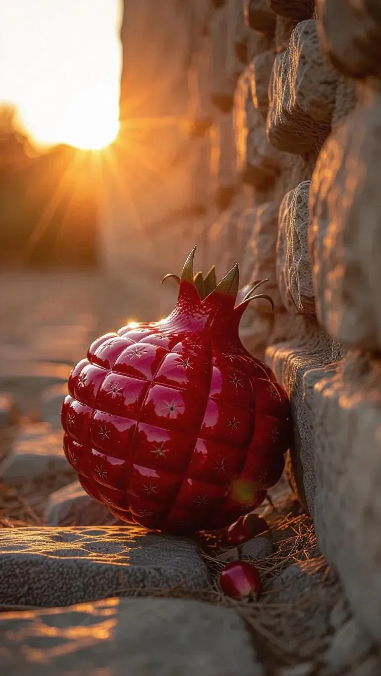 A grenade designed from clusters of vibrant pomegranates, bright red and glistening in the evening light, leans against a stone wall at sunset. The wall's rustic texture and warm tones of dusk highlight the grenade's elegant yet explosive design. Soft, warm light bathes the scene, casting gentle shadows and enhancing the pomegranate grenade's striking color. The image style is classic, capturing the intricate details of the pomegranates and the historical beauty of the wall.
