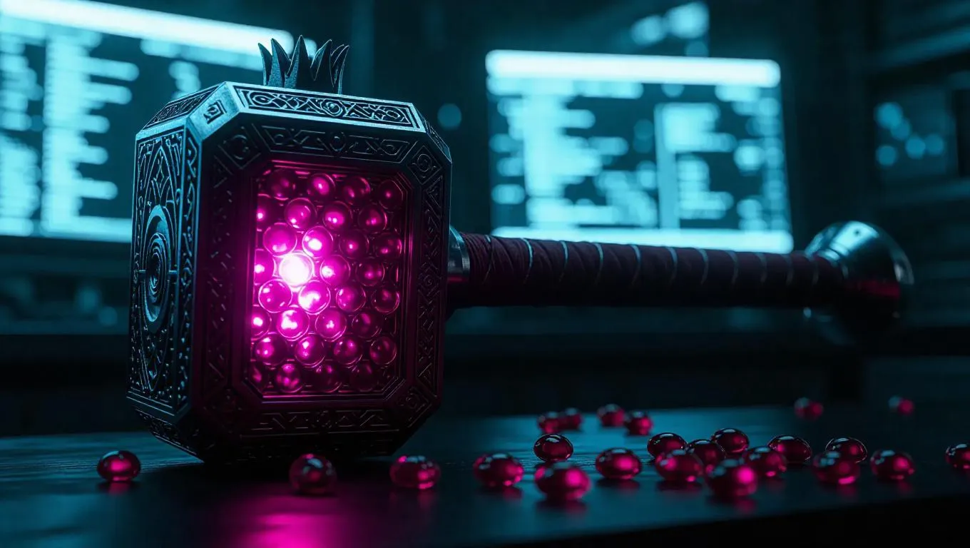 A warhammer forged from the dense, jewel-like seeds of a pomegranate, featuring a metallic silver hue that glows ominously. The hammer's head is intricately carved with mechanical engravings, and its handle is wrapped in synthetic material. Set against a backdrop of a high-tech laboratory, the scene is illuminated by the bright, flickering light of computer screens, casting sharp shadows and highlighting the hammer's glowing silver surface. The style is sci-fi fantasy, emphasizing the mystical and ominous nature of the weapon.