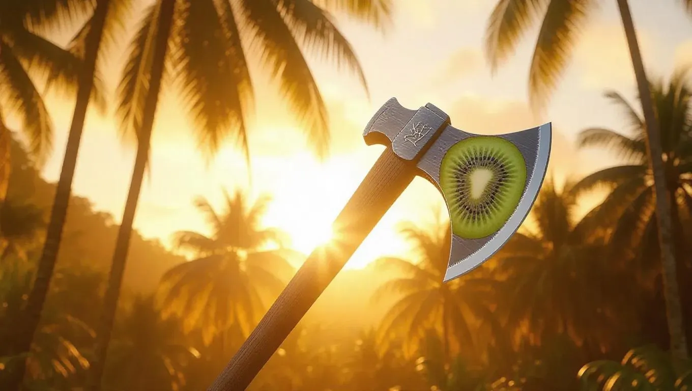 Axe with a vibrant kiwi blade, tropical aesthetic, soft lighting, tall palm trees, warm golden hues, and a dramatic shadow play, capturing the essence of a sunlit jungle.
