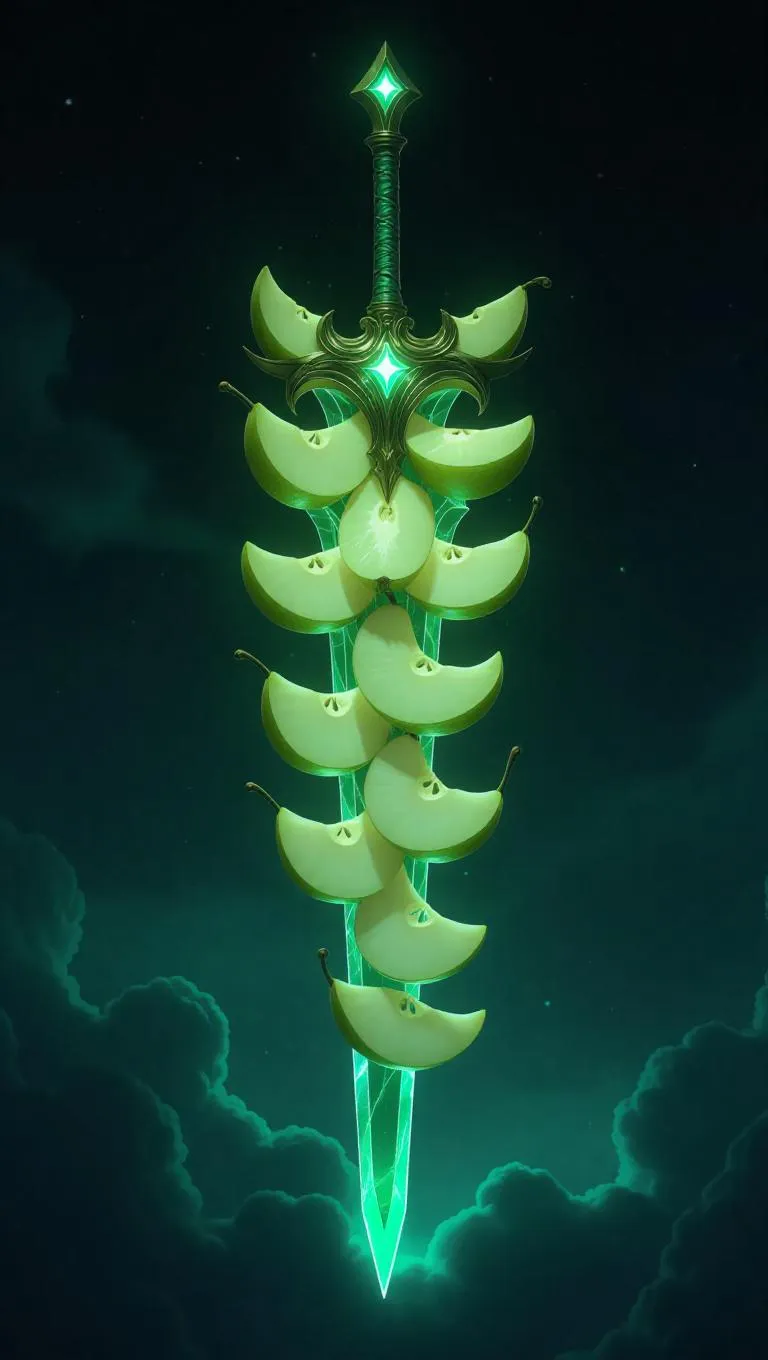 A glaive crafted from overlapping pear segments, with a translucent, light green core that emits a soft, celestial glow. The weapon has a tall, regal design, set against a starry night sky that enhances its otherworldly beauty. The scene is bathed in subtle, ambient light, with stars twinkling in the background. The style is fantastical, blending realism with ethereal elements.
