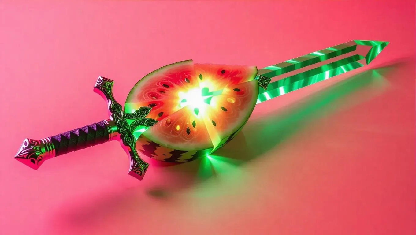 A sword meticulously crafted from vibrant watermelon slices, featuring a glowing green core that radiates a mystical light, with an elegant and refined design, set against a minimalist background that highlights its unique beauty.