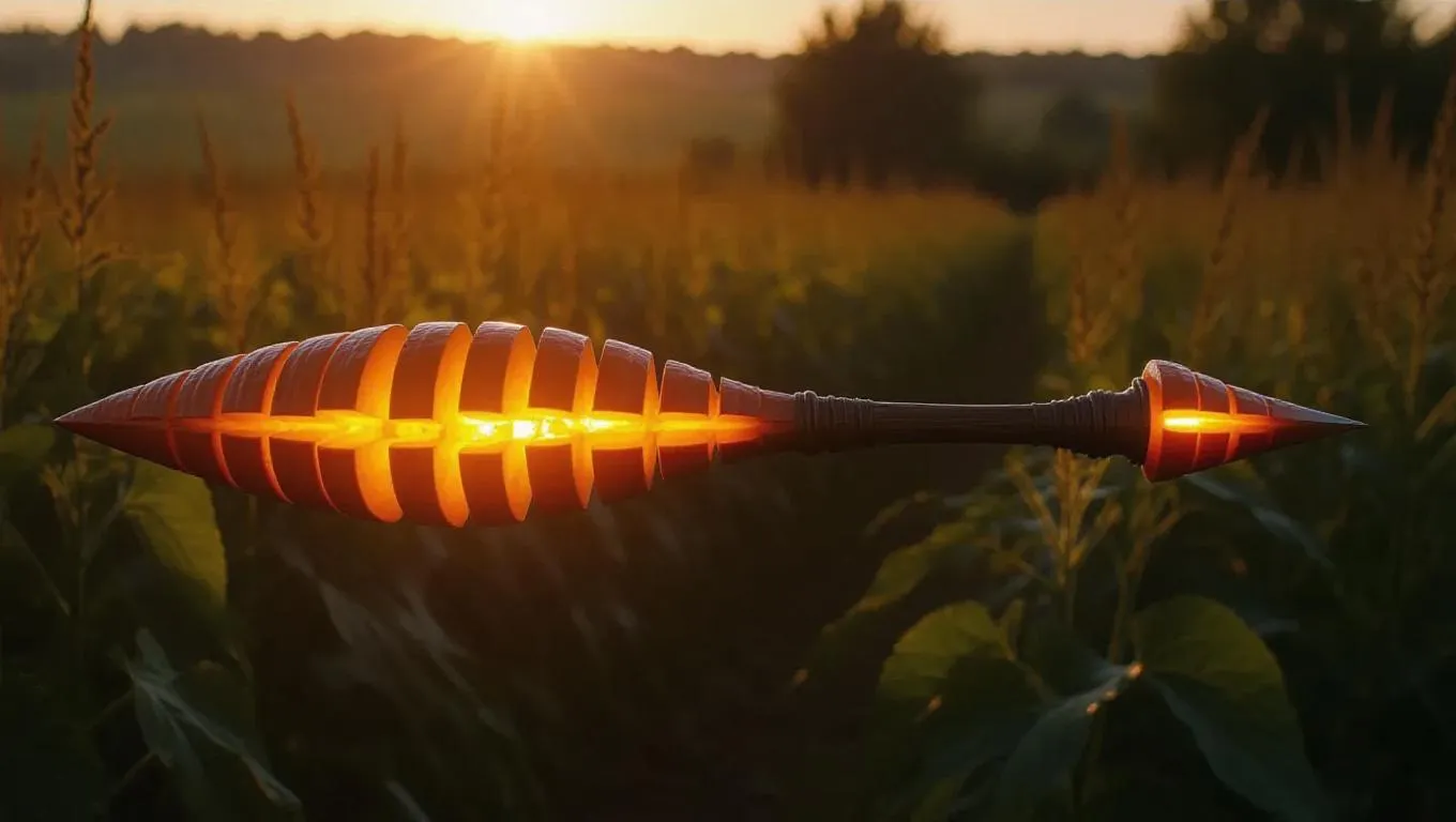 A spear forged from elongated pumpkin slices, with a warm, orange core emitting an enchanting glow, showcasing a sleek, streamlined design. Set against a serene, countryside background, the tranquil beauty of the spear is highlighted by soft, diffused lighting, creating a calm and ethereal atmosphere. The fields reflect the spear's luminescence, enhancing its otherworldly appearance. Style: Realistic.
