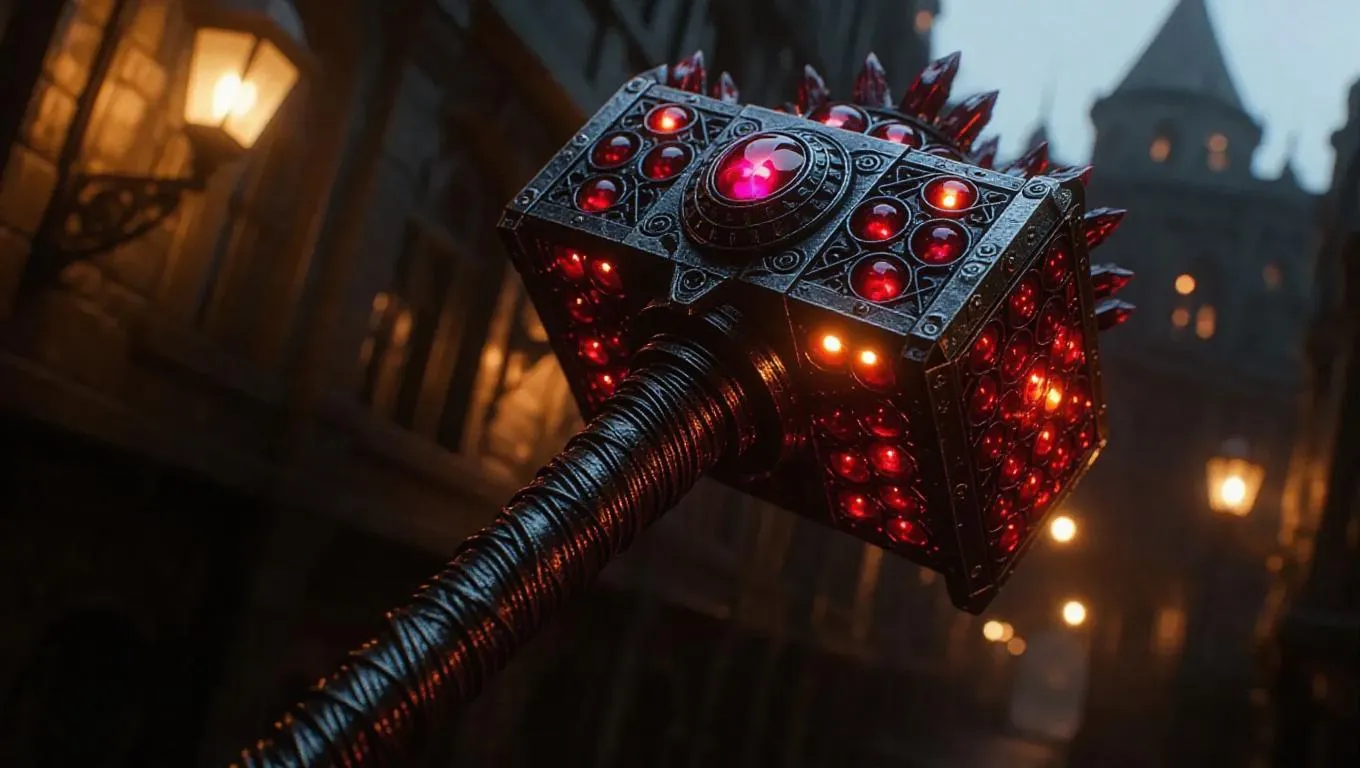 A warhammer forged from the dense, jewel-like seeds of a pomegranate, featuring a glimmering bronze hue that glows ominously. The hammer's head is intricately carved with mechanical features, and its handle is wrapped in braided metal. Set against a backdrop of a steampunk city, the scene is illuminated by the flickering light of gas lamps, casting industrial shadows and highlighting the hammer's glowing bronze surface. The style is steampunk fantasy, emphasizing the mystical and ominous nature of the weapon.