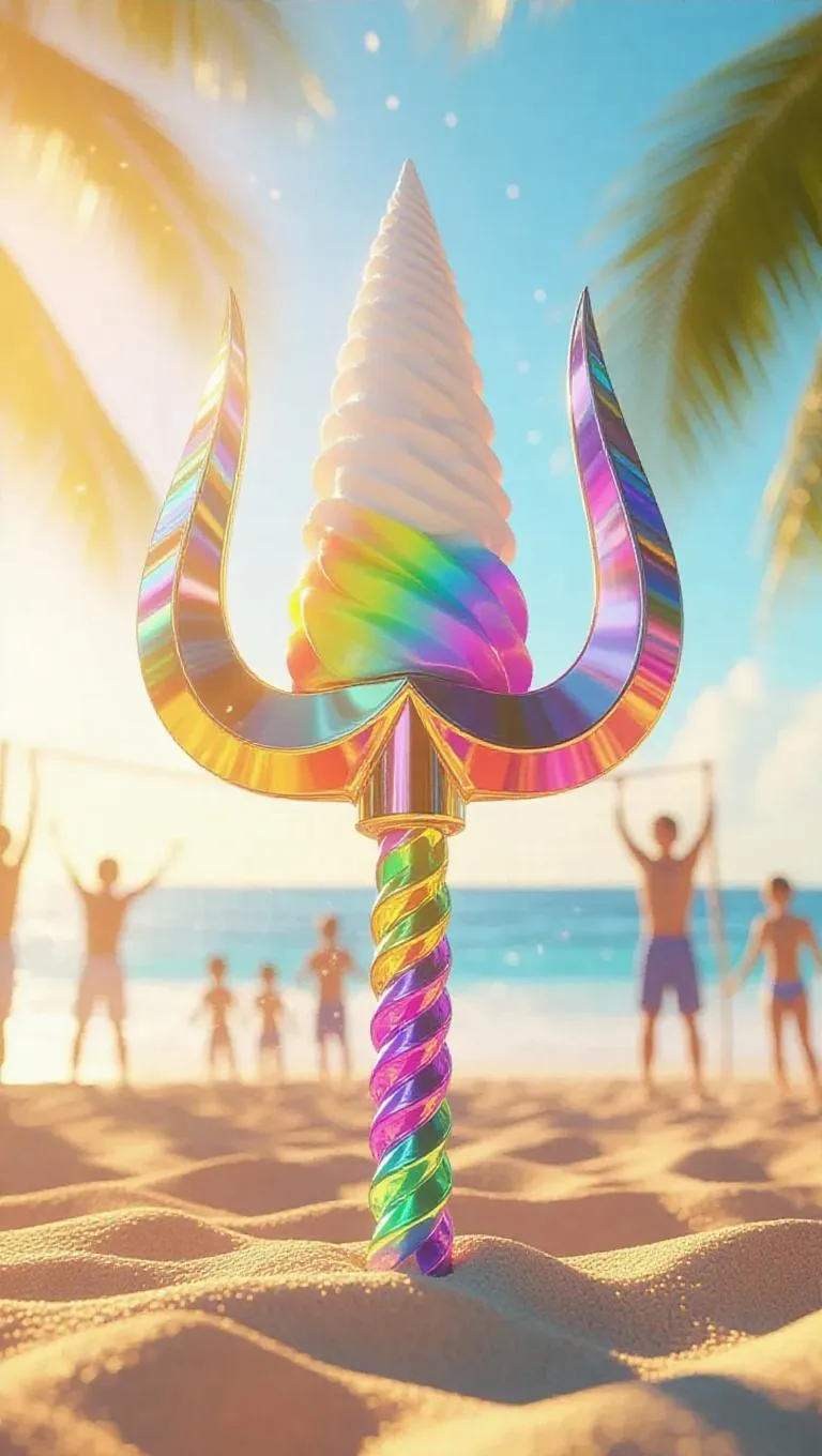 A trident intricately crafted from overlapping snow cones, featuring a vibrant, rainbow core that crackles with zesty energy. The bold and dynamic design is set against a tropical beach background, with kids playing beach volleyball and the sun casting warm, golden light. The scene exudes liveliness and invigoration, capturing the essence of a sunny, coastal paradise.